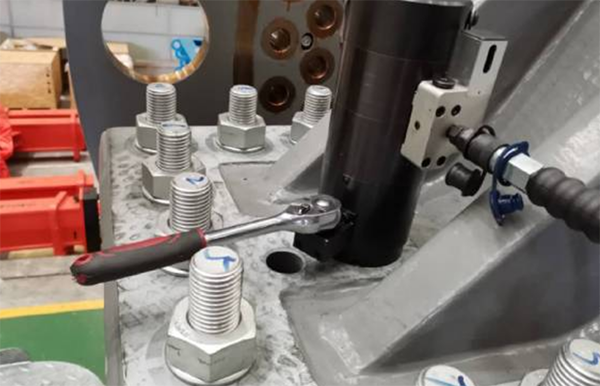 當(dāng)拉伸器安裝到位后,再次用手動扭矩扳手順時針旋轉(zhuǎn)齒輪箱四方驅(qū)動裝置,保證螺母與接觸面達到預(yù)緊,安裝完成。之后,重復(fù)以上操作安裝其他拉伸器并用高壓油管互相連接 之后就可以連接超高壓泵站調(diào)至需要拉伸多力對應(yīng)設(shè)定的壓力開始拉伸。