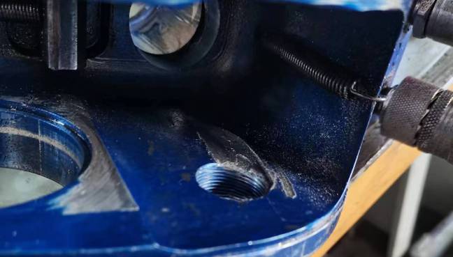 我們拆解檢查發(fā)現(xiàn),改扳手的兩側(cè)驅(qū)動(dòng)板在同一位置發(fā)生斷裂,油缸外沿刮擦缺損嚴(yán)重,殼體內(nèi)腔出現(xiàn)嚴(yán)重刮削凹痕,整個(gè)扳手內(nèi)部充滿金屬碎屑。從各部位損傷跡象我們可以推導(dǎo)出最先出現(xiàn)問題的應(yīng)該是驅(qū)動(dòng)板。長(zhǎng)期高負(fù)荷運(yùn)行或者使用過程中的受力不均導(dǎo)致液壓扳手驅(qū)動(dòng)板出現(xiàn)損傷,但彼時(shí)并沒有達(dá)到非常嚴(yán)重的斷裂,扳手有些微卡但依然能夠轉(zhuǎn)動(dòng)使用,導(dǎo)致操作人員沒有及時(shí)發(fā)現(xiàn)和處理。但這個(gè)時(shí)候裂痕使得驅(qū)動(dòng)板不再光滑,并與殼體及油缸外沿產(chǎn)生接觸和刮削嚴(yán)重?fù)p傷了油缸和殼體。同時(shí),刮擦下來的金屬碎屑又在運(yùn)動(dòng)中進(jìn)入棘輪棘爪,對(duì)棘輪棘爪也造成了不小傷害。本來只用更換驅(qū)動(dòng)板,卻差點(diǎn)毀了整個(gè)扳手。