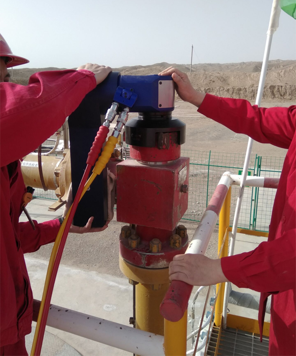 經過我們該區(qū)域的現(xiàn)場銷售工程師勘察測量做出解決方案,BOLTING(博霆)為之專門定制的天然氣單井固定式節(jié)流閥專用液壓扭矩扳手解決了困擾他們難題,得到了用戶的認可,施工現(xiàn)場如下: