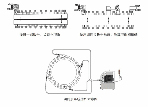 對(duì)于較大的扳手,建議用一臺(tái)泵控制兩同步系統(tǒng),或二泵二扳手同時(shí)對(duì)邊鎖緊的雙系統(tǒng)。