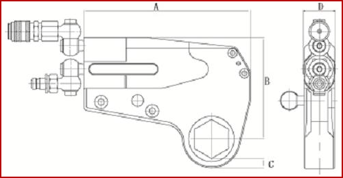 中空液壓扳手的局限性也有,比如說有些使用單位希望用一個工作頭來實(shí)現(xiàn)多種工況螺母工作,這個時候他們會選擇襯圈增加使用范圍。但是,增加襯圈會增加工作頭的厚度,也就是下圖中的C值變大: